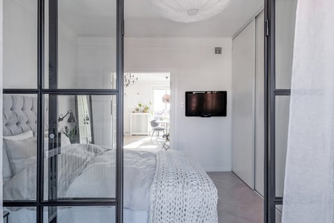 Säljaren har satt in en glasvägg som ger lägenheten ett extra smart kontor/barnrum. Sovrummet är beläget i anslutning till den andra terrassen.Sammantaget en mycket välplanerad och ljus lägenhet i toppskick.