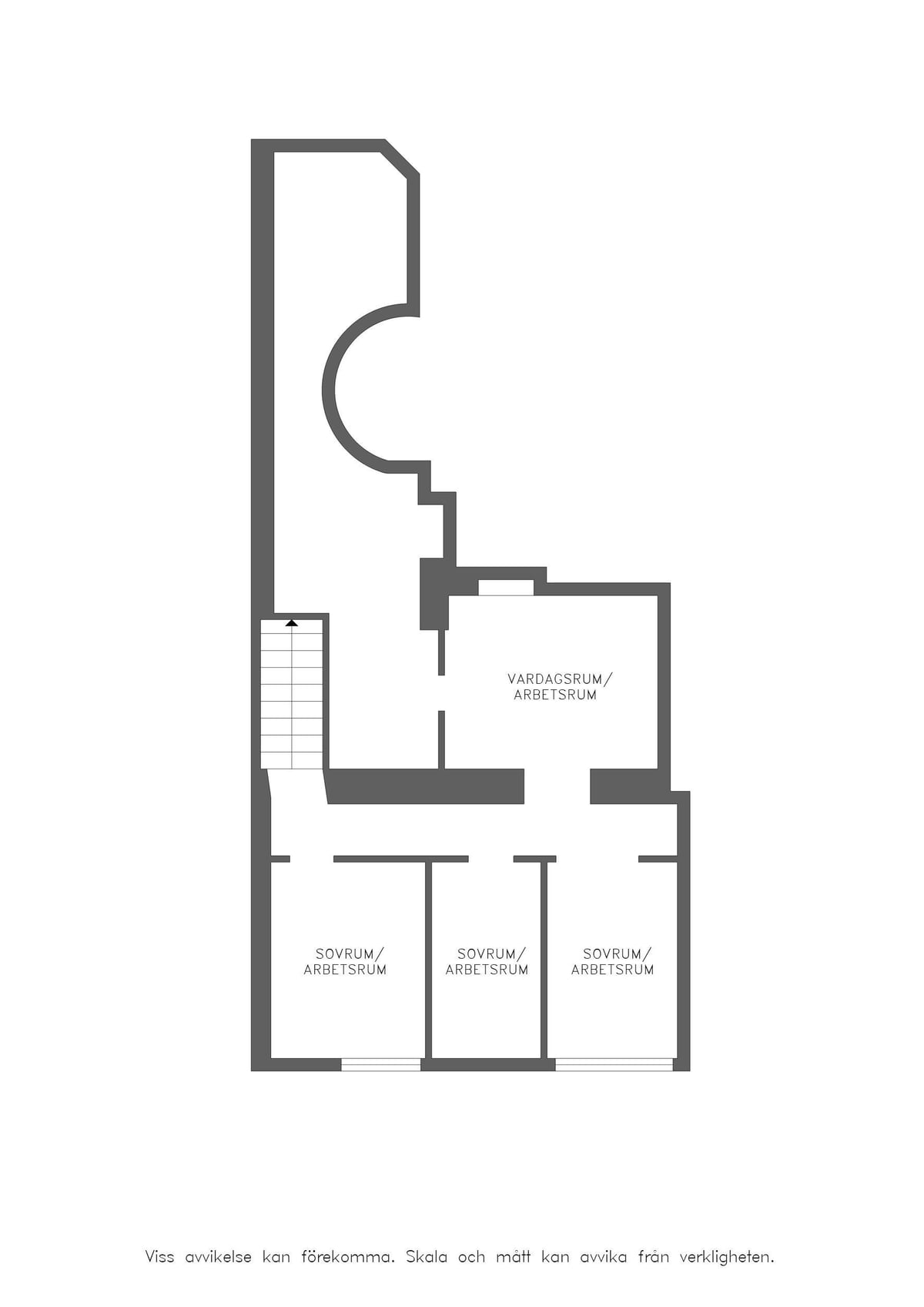 En trappa ner har man tre rum i fil som kan användas som sovrum alternativt kontorsrum. Dessutom ett stort allrum för både användning och möblering.